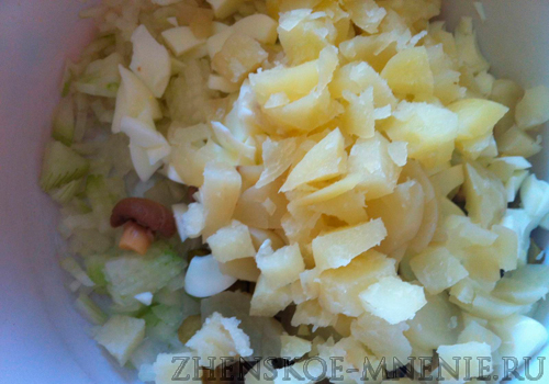 Кубики картофеля добавляем к луку, огурцам и грибам.