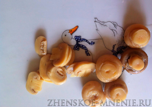 Маринованные грибочки извлечем из маринада и порежем.