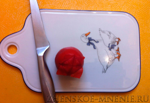 Помидор подержим в кипятке и тоже освободим его от кожицы.