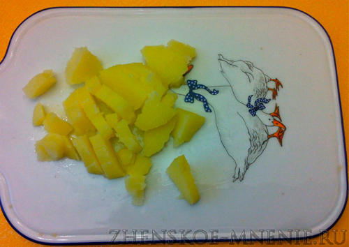 Картофель нам нужен в виде кубиков или брусочков. Перепелиные яйца будем