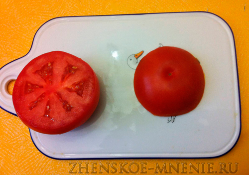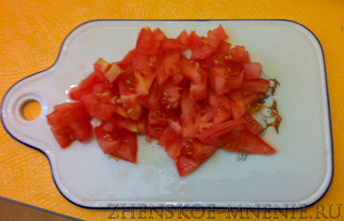 Оставшиеся помидоры необходимо порезать кубиками. Хорошо, если они будут плотными и мясистыми.