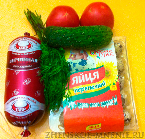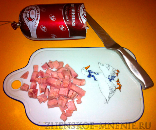 На фото: ингредиенты для приготовления салат с ветчиной Перепелка