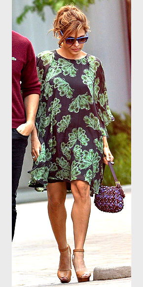 Дженнифер носит платье от Ella Moss. Рискованно, ведь горизонтальные полосы