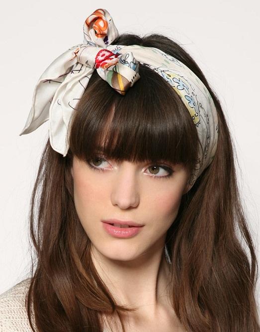И последний, весьма интересный вариант, когда декоративная повязка надевается поверх челки, ее располагают выше линии роста челки, то есть, где- то посреди головы. Здесь подойдут и шелковые платки, а вот от спортивных или шерстяных придется отказаться.