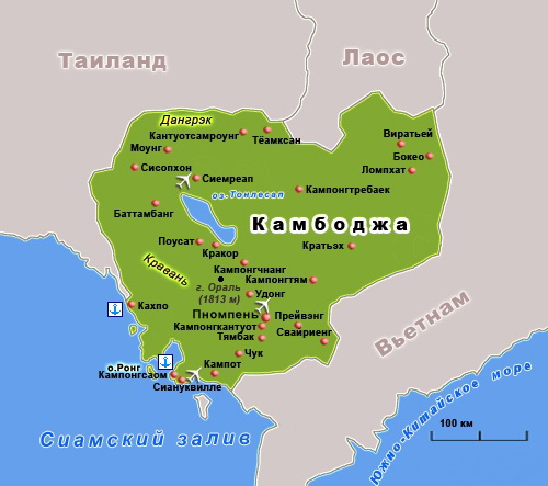 Королевство Камбоджа расположено на острове Индокитай. С западной стороныгосударство граничит с Тайландом, на севере его соседи — Лаос, а на